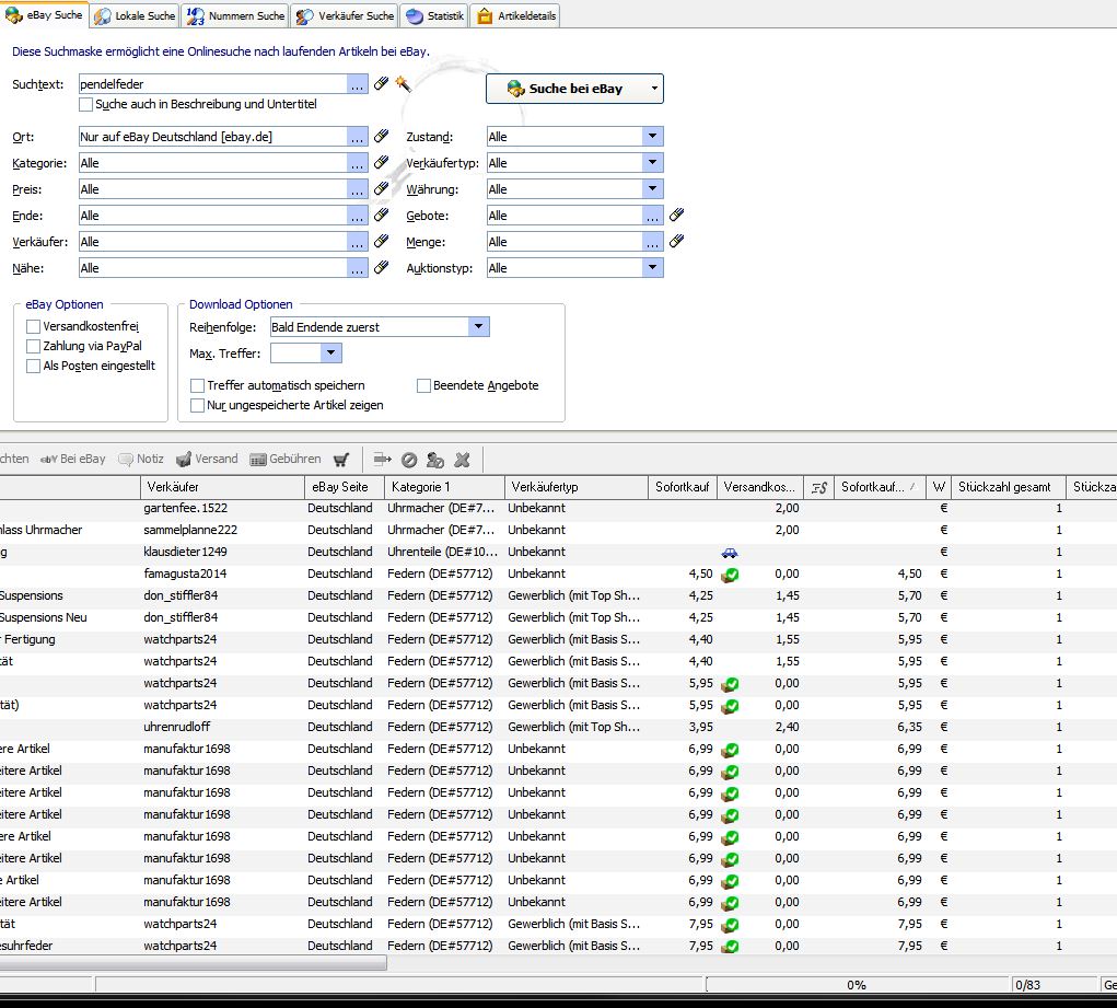 Habe gerade nach "Pendelfeder" gesucht (ohne weitere Filter) und erhalte 82 Treffer.Saskatchewan hat geschrieben:Das ist schon richtig, aber mir werden nur vier (4) verschiedene verkäufer aufgelistet, diverse Verkäufer fehlen in der BW-Suche... keiner der fehlenden Verkäufer in der Ignorier-Liste, kein Artikel der fehlenden verkäufer ignoriert.
